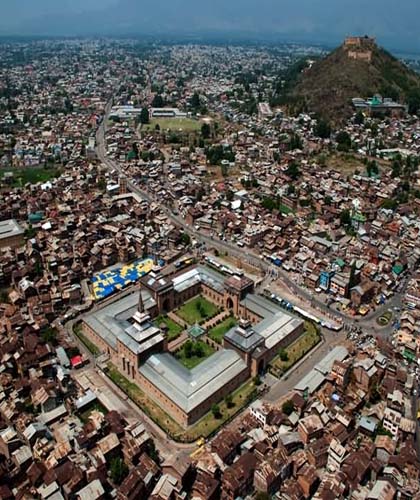 Downtown Srinagar is characterized by iconic landmarks such as the Jamia Masjid, Shah Hamdan's Shrine, and the bustling markets of Nowhatta.